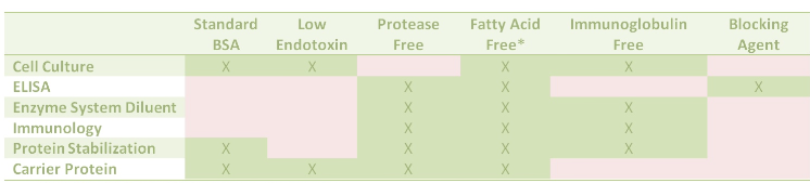 該圖表很簡(jiǎn)單明了的說(shuō)明了不同BSA的不同用途。很明顯,不含脂肪酸的BSA和不含蛋白酶的BSA在多種技術(shù)中都能很好地發(fā)揮作用,使其成為更理想的產(chǎn)品,而阻斷BSA僅用于ELISA中的阻斷劑。
