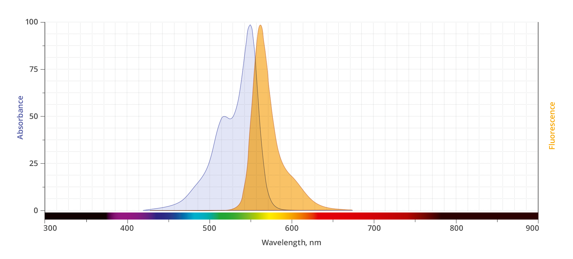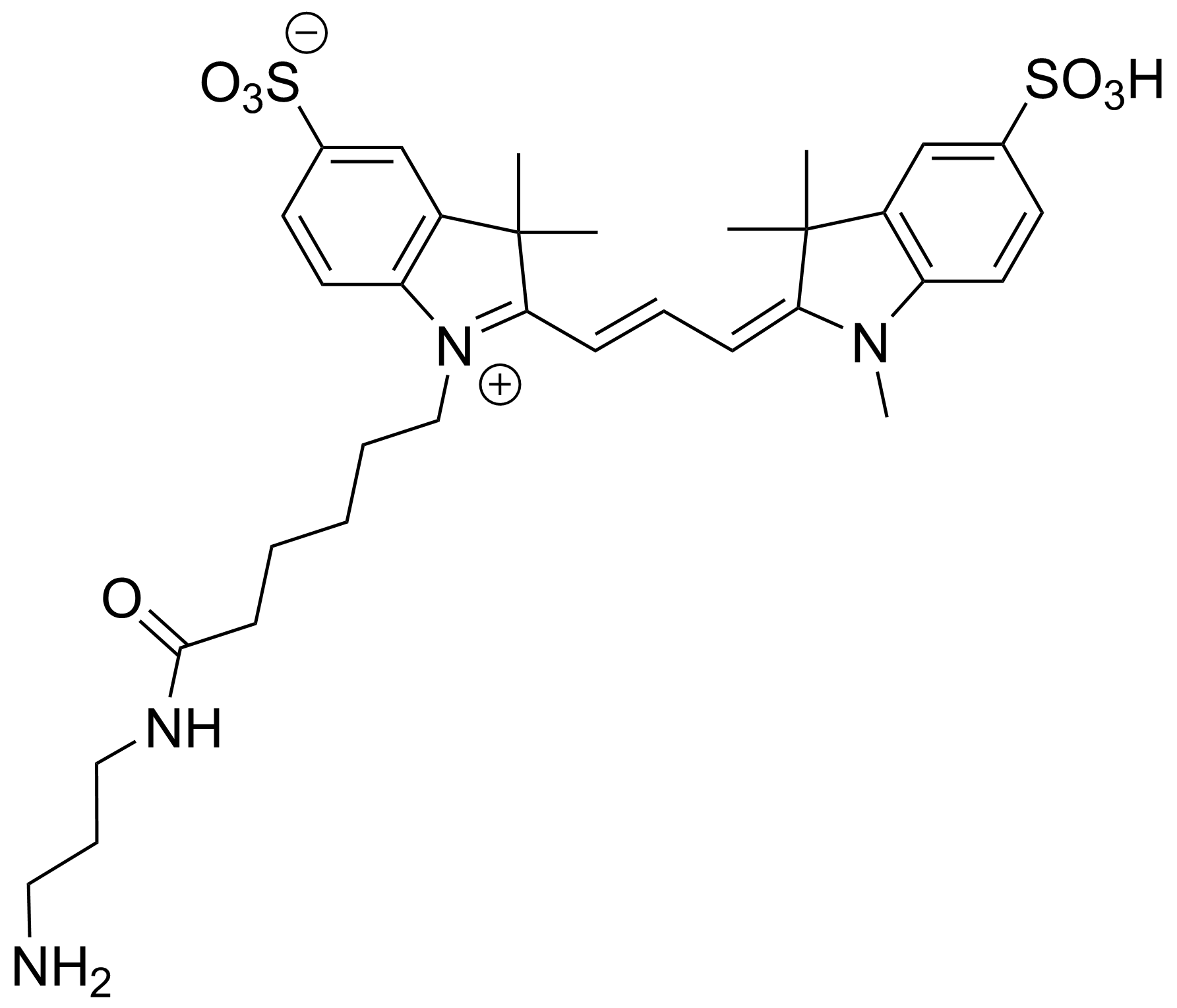 Cy3 Amine (also as Sulfo-Cyanine3 Amine) is a bright, water-soluble, and pH insensitive from pH 4 to pH 10 orange-fluorescent dye. Cy3 conjugates of antibodies, peptides, and proteins can be excited using the 532 nm or 555 nm laser line and visualized with TRITC (tetramethylrhodamine) filter sets. Cy3 conjugates give less background than TAMRA and most other commonly used fluorescent dyes.