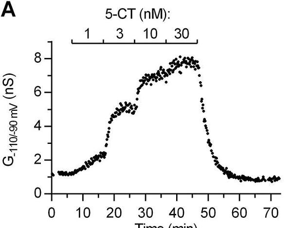 (A) 代表性實(shí)驗(yàn) (n = 6) 的時(shí)間過程顯示了增加浴液濃度的影響,應(yīng)用 5-HT1A 受體激動(dòng)劑、5-CT 對(duì)背側(cè)向內(nèi)整流 K+ 電導(dǎo) (G-110/-90 mV) 的影響 raphe 5-HT 神經(jīng)元。細(xì)胞外溶液含有 5.5 mM K+ 和混合突觸阻滯劑。 在該圖中,時(shí)間表示全細(xì)胞配置的持續(xù)時(shí)間。