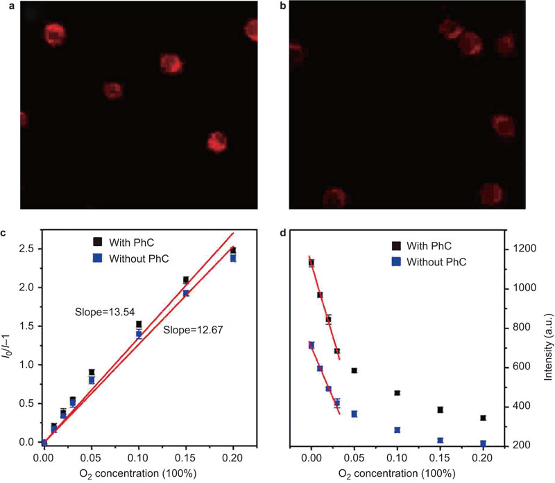 Confocal image of the MCF-7 cells on the PhC (a) and on the glass (b), respectively. (c) (I0/I−1) of [Ru(dpp)3]Cl2 on the PhC (black dots), glass (blue dots) and fitting line (red line). (d) The luminescence intensity of [Ru(dpp)3]Cl2 in MCF-7 cells with different oxygen concentrations on the PhC (black dots) and on the glass (blue dots), respectively. PhC, photonic crystal.