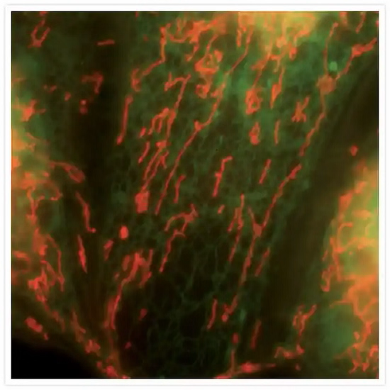 用 ER-Tracker Green 和 MitoTracker Red CMXRos 標(biāo)記的活牛肺動脈內(nèi)皮細胞。