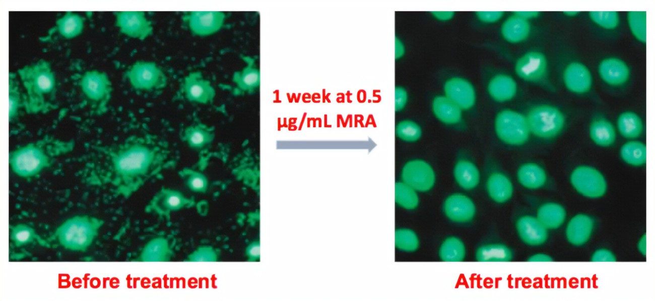 3. 向培養(yǎng)基中添加新鮮支原體去除劑溶液,每3-4天更換一次。兩周的治療應(yīng)足以消除污染。有效工作濃度范圍為5-25µg/ml;10µg/ml適合大多數(shù)應(yīng)用場(chǎng)景。