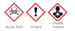 | 防范說明代碼 | P201, P202, P260, P261, P262, P264, P270, P271, P280, P281, P284, P301+P310, P301+P312, P302+P350, P302+P352, P304+P340, P305+P351+P338, P308+P313, P310, P312, P314, P320, P321, P322, P330, P332+P313, P337+P313, P361, P362, P363, P403+P233, P405, and P501 |